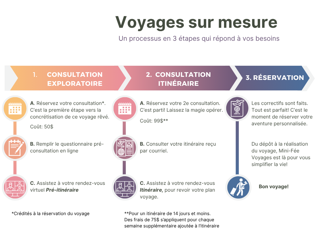 Pour débuter l’aventure, Mini-fée Voyages vous propose un premier rendez-vous exploratoire. Cette consultation virtuelle de 30 minutes permet de dresser les grandes lignes de ce voyage tout en prenant compte de vos attentes. Le coût de 50$ de la consultation est crédité lors de la réservation du voyage avec Mini-Fée Voyages.